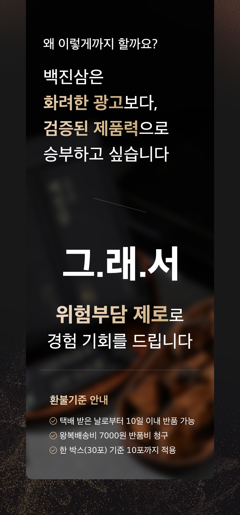 A. 네. 정말로 해드립니다. 택배 받은날로부터 7일 이며, 섭취 후 효과를 못 느끼거나 불만족한 경우 최대 7포까지 적용이 됩니다. (택배비 별도) |